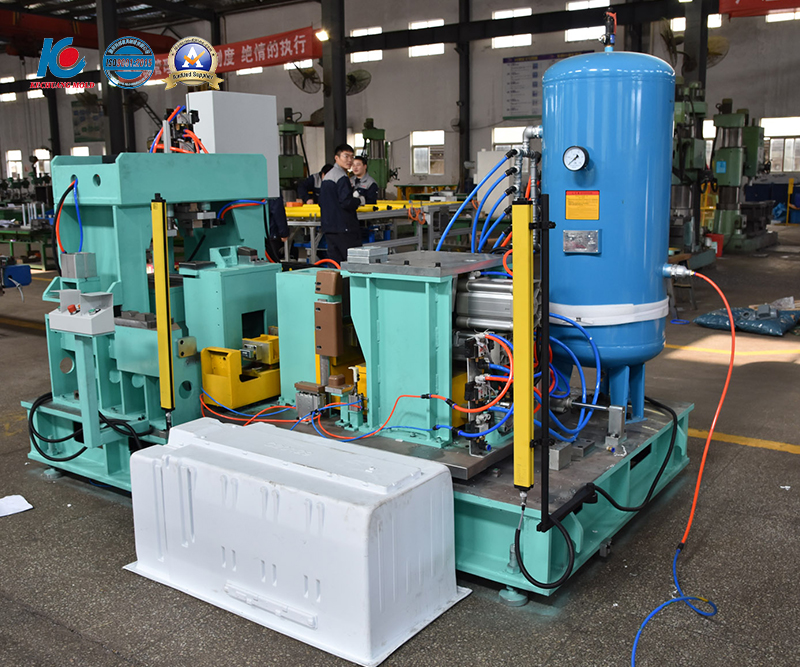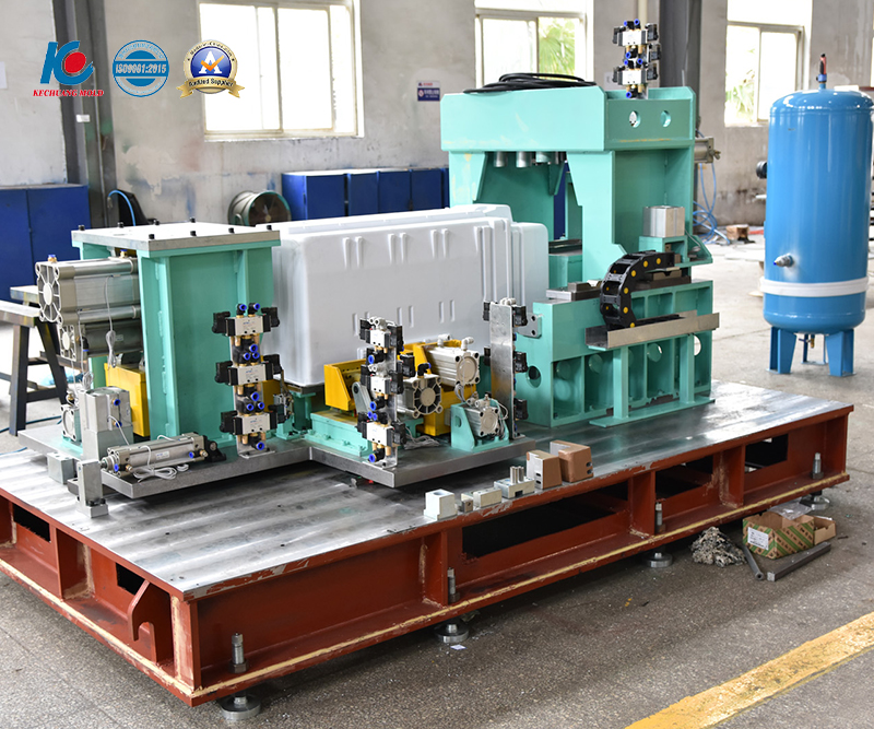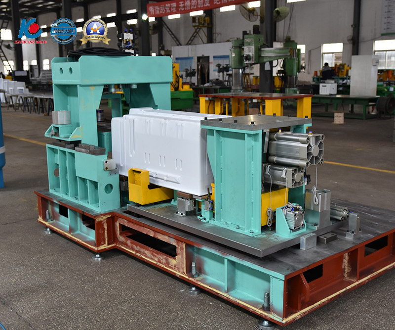 It is punching mould for inner liner of refrigerator cabinet,the upper and lower moulds adopt the guide column and guide sleeve for accurate guidance with using the hydraulic system as the power unit and the oil cylinder as the executive element,equipped with punching position detection to achieve all the holes of cabinet inner liner are punched at one time.The punching size is accurate and stable,and the mould is efficient,safe and reliable.
