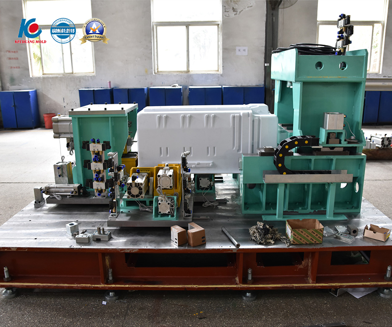 It is punching mould for inner liner of refrigerator cabinet,the upper and lower moulds adopt the guide column and guide sleeve for accurate guidance with using the hydraulic system as the power unit and the oil cylinder as the executive element,equipped with punching position detection to achieve all the holes of cabinet inner liner are punched at one time.